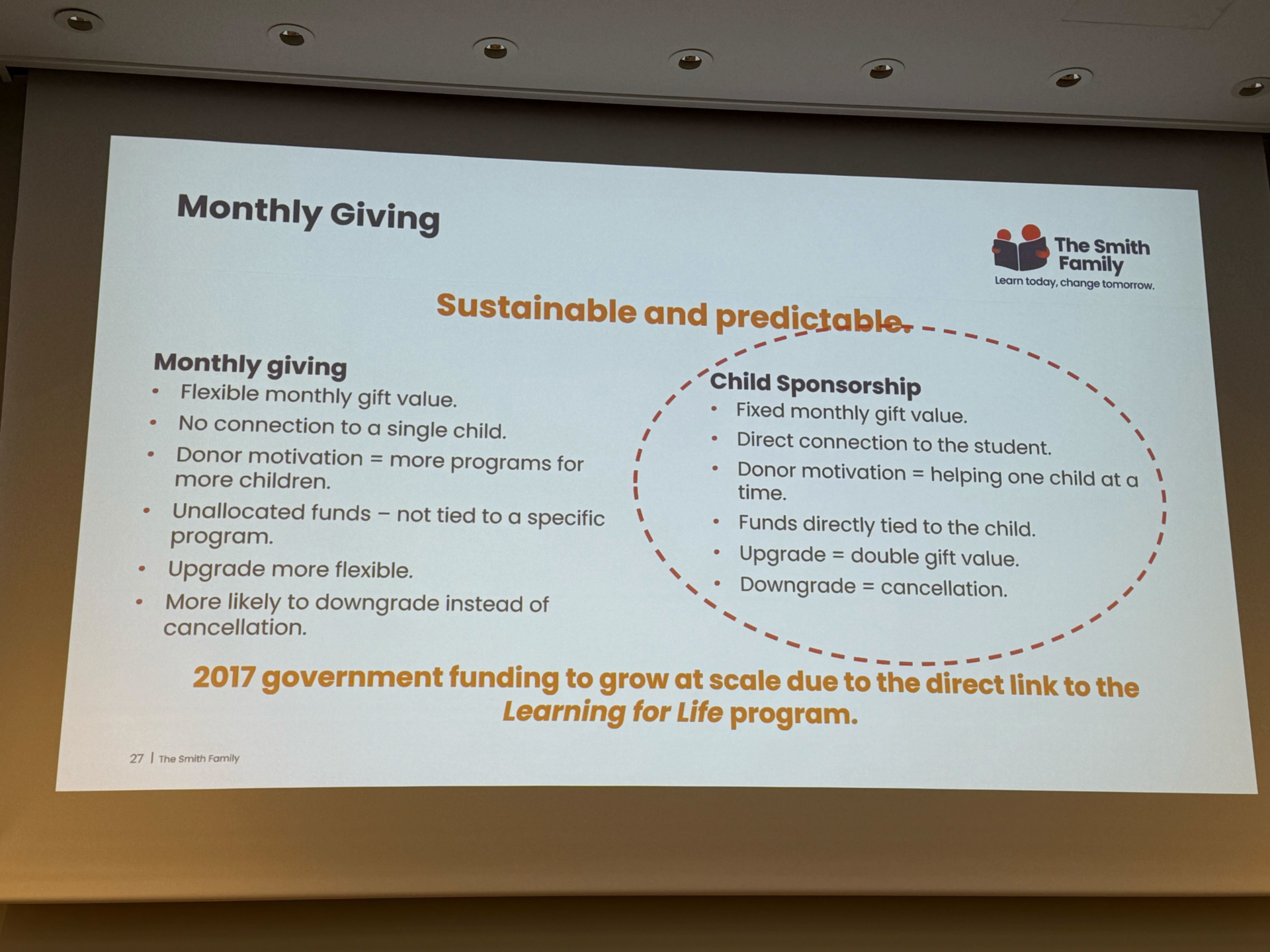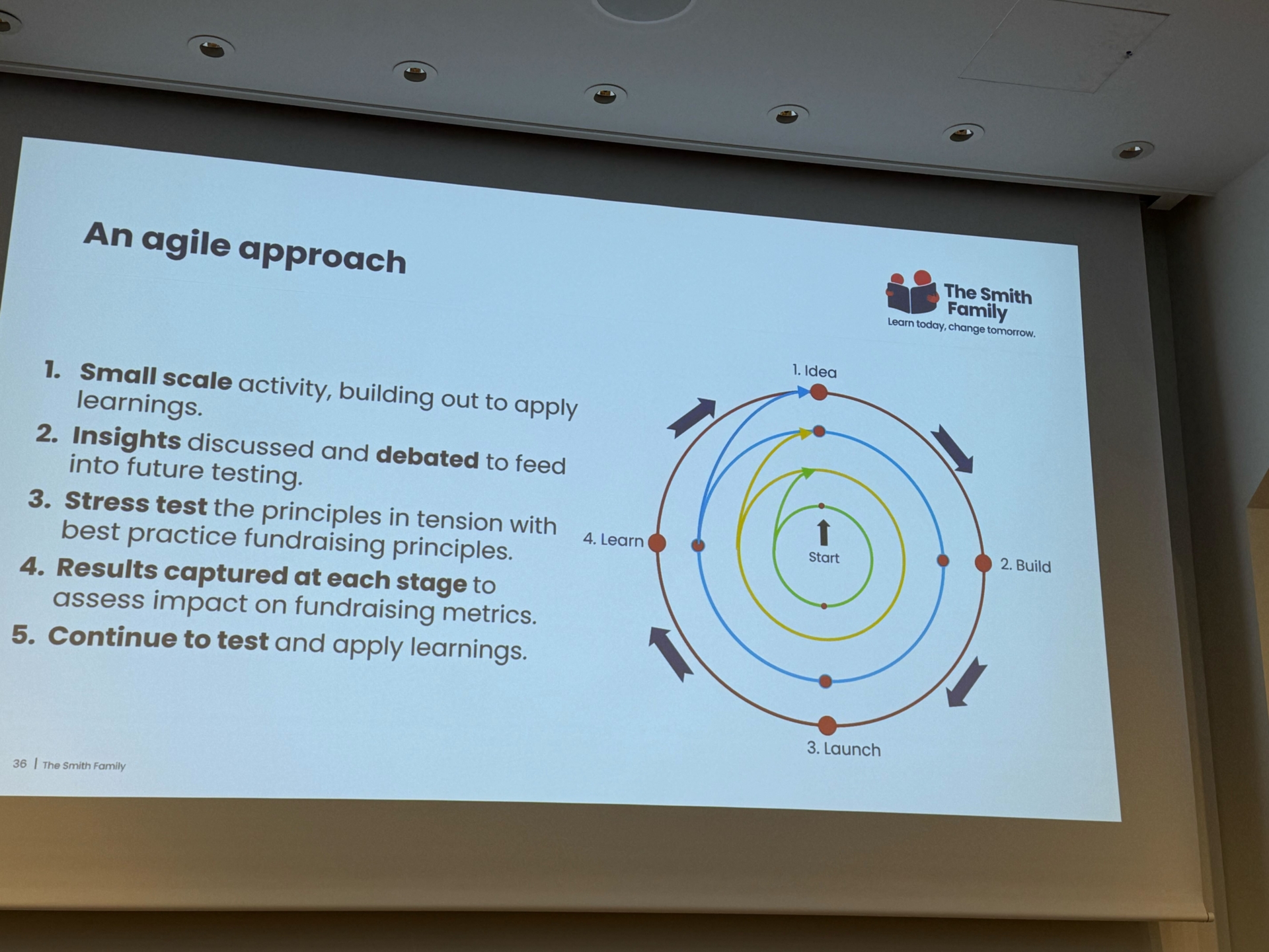 1部はオーストラリアの歴史あるNPO、The Smith Family における個人寄付統括責任者のLouise Woodsさんによる特別講演でした。時代に合わせて変遷を遂げてきた歴史ある団体の知見をたくさん分けていただきました。活動の始まりは児童養護施設に住む子供たちへのクリスマスプレゼントを5人のビジネスマンが有志で集まって送ったことから始まったとのことですが、そこから現在は学習格差の解決に向けたITCも取り入れた学習支援や奨学金制度などの取り組みにまで発展しています。その時代時代に合わせて柔軟に形を変えながら社会課題の解決に向け取り組むことの難しさ、内部の人間の葛藤や努力が伝わる素晴らしい講演でした。 公式サイト:https://www.thesmithfamily.com.au/