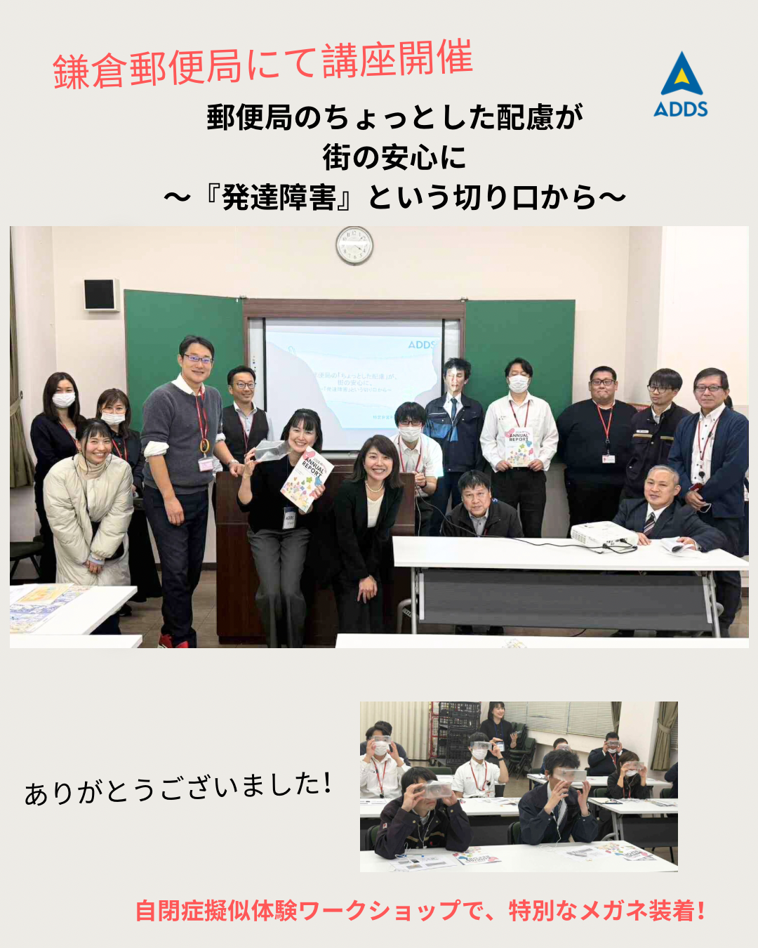鎌倉郵便局の皆さまが、熱心に体験にご参加してくださり、また、日々の業務の中での実例を挙げていただきながら、どのようなサポートが可能かを話し合ってくださいました。日常生活に欠かせない郵便局での理解が広がり、態勢を整えてくださろうとしている姿に、とても心強く感じました。ありがとうございました!