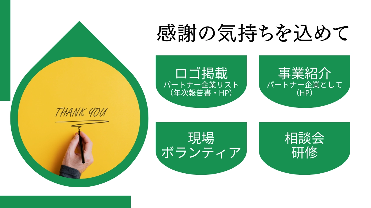 寄付を始めとする様々なパートナーシップの形や事例についても詳しく掲載しておりますので、よろしければこちらのページにお目通しください。